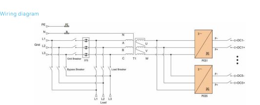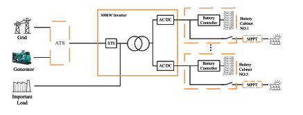 Карактеристика Системот користи модуларни инвертер единици во паралелна конфигурација, каде DC-влезот на секој инвертер модул одговара на посветен кабинет за батерии, овозможувајќи управување по кластер да ги елиминира циркулирачките струи помеѓу жици на батерии. Модулите за напојување со AC/DC поддржуваат флексибилно распоредување и во количина и рејтинг на моќност, со максимален капацитет од 60 kW модули во паралела од 5 единици конфигурација. Излезот наизменична струја од модулите за напојување се испорачува преку трансформатор изолирана излезна фаза, снабдувајќи ја моќноста на товарот со силен отпор кон тековен шок. Хибридниот ESS користи фотоволтаична интеграција поврзана со DC, постигнувајќи високи ефикасност на конверзија на енергија и оптимизирана за сценарија надвор од мрежата со PV производствен капацитет кој ја надминува побарувачката на оптоварување; MPPT контролери со оцена на отворено интегрирајте ги функционалностите на комбинирачот и MPPT во едно зацврстено куќиште. Комплетниот систем вклучува опција ATS на дизел генератор, хибрид од 300 kW инвертер, PV MPPT контролер и систем за складирање на енергија од батерии.